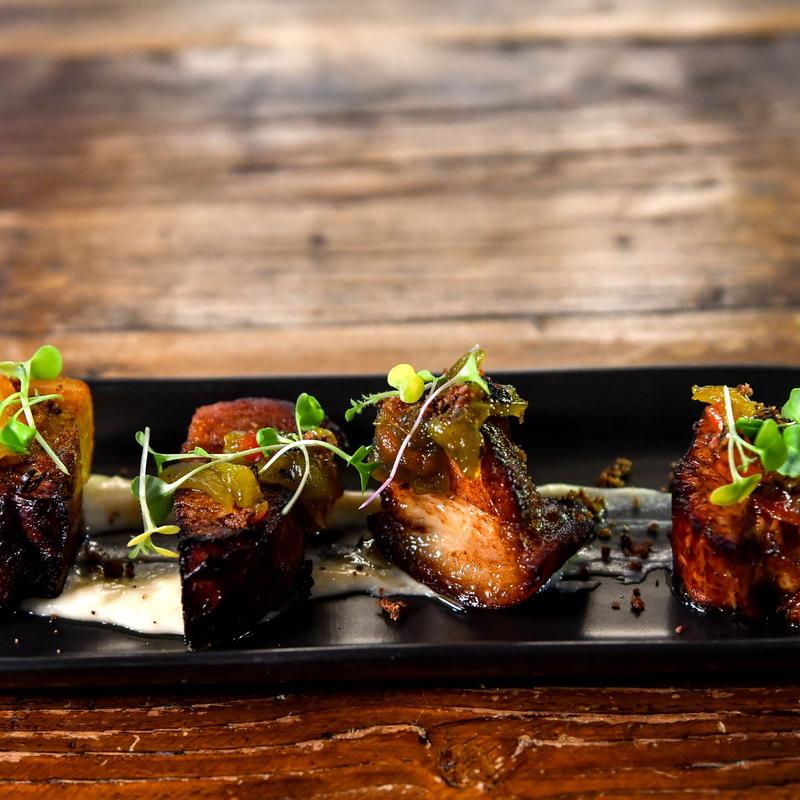 Green chile jam glazed pork belly bites, agave honey goat cheese spread, fig compote, finished with a blue corn crumble and pistachio